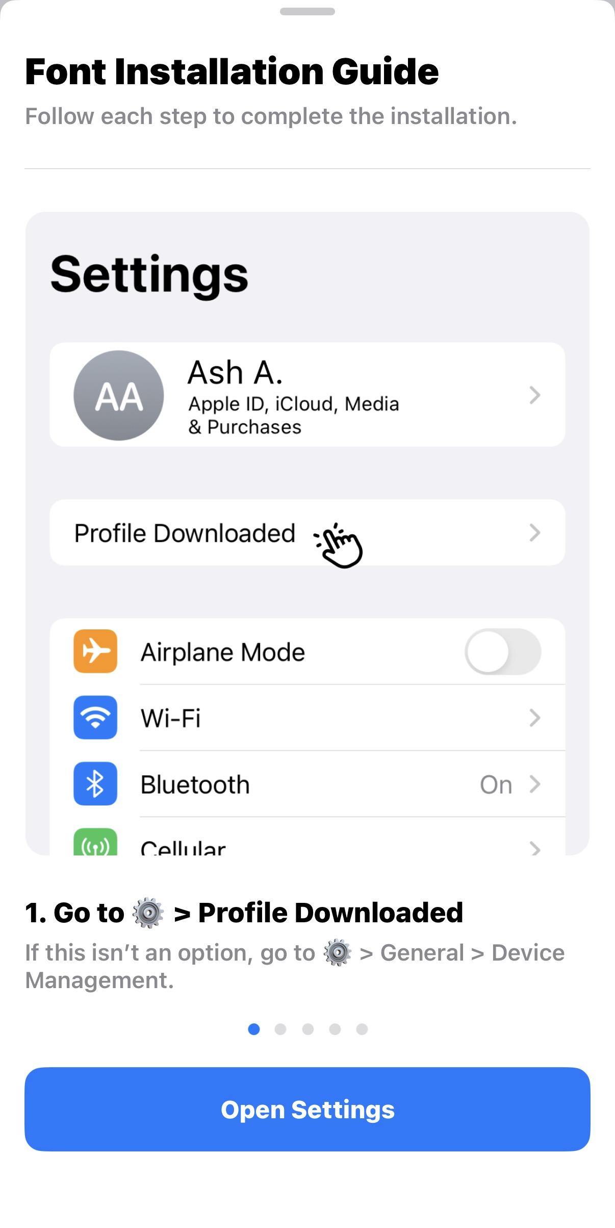 • 설정에서 프로파일 설치/허용까지 완료하면 폰트 사용 가능