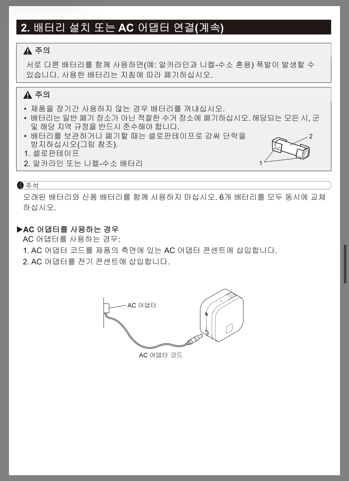 전원은 AAA 건전지 6개가 기본이고 AC 어댑터(별매 옵션)도 지원한다.